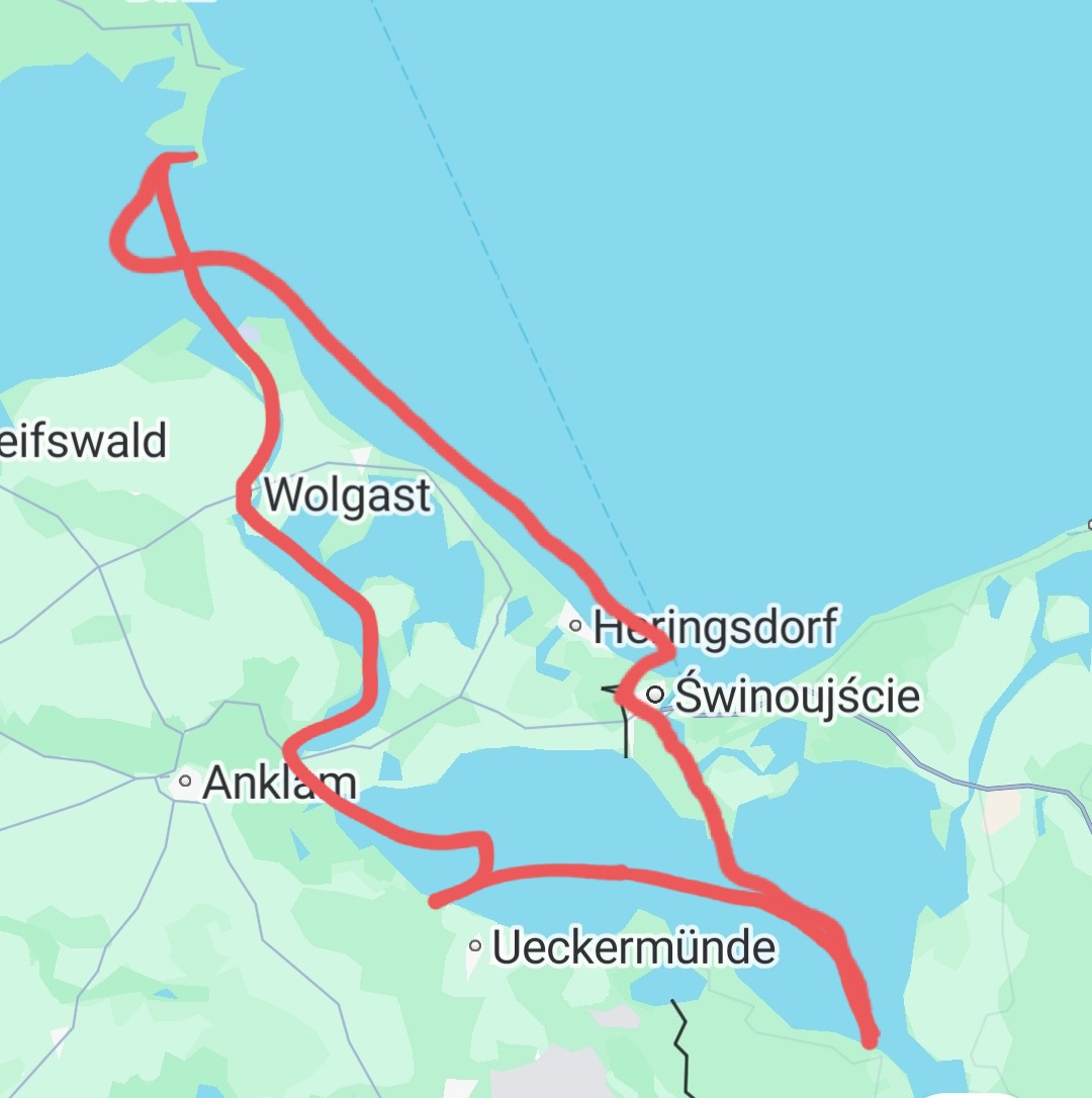 Trasa: Trzebież – Nowe Warpno – Ukermunde – Wolin – Świnoujście – Dziwnów – Kamień Pomorski – Świnoujście – Stepnica – Trzebież